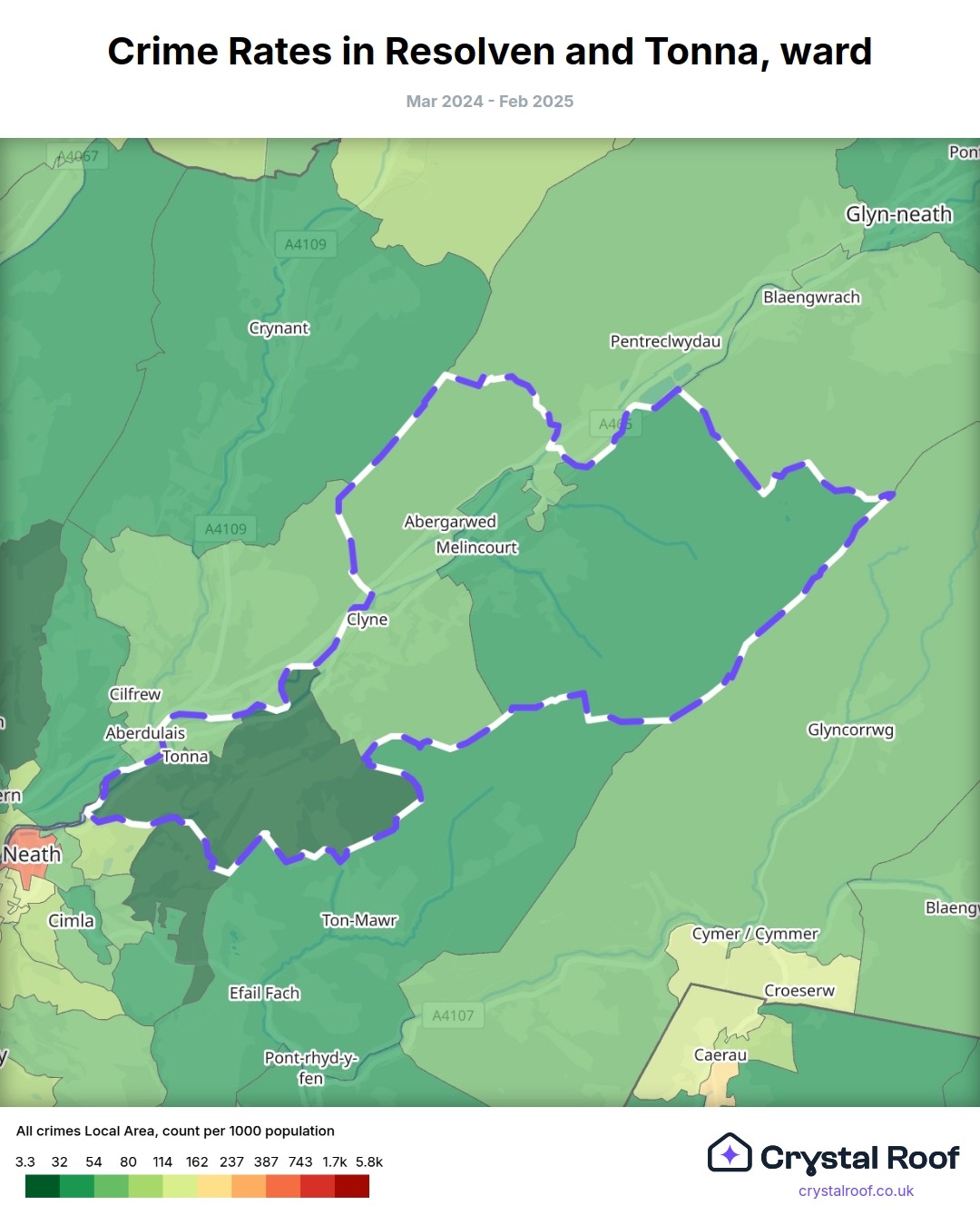 Resolven and Tonna, (ward) includes areas with the following crime ratings (see map):