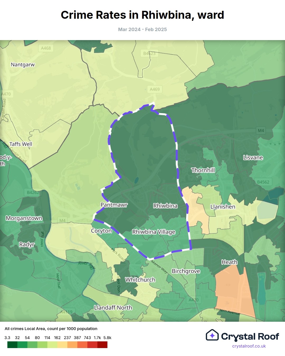 Rhiwbina, (ward) includes areas with the following crime ratings (see map):