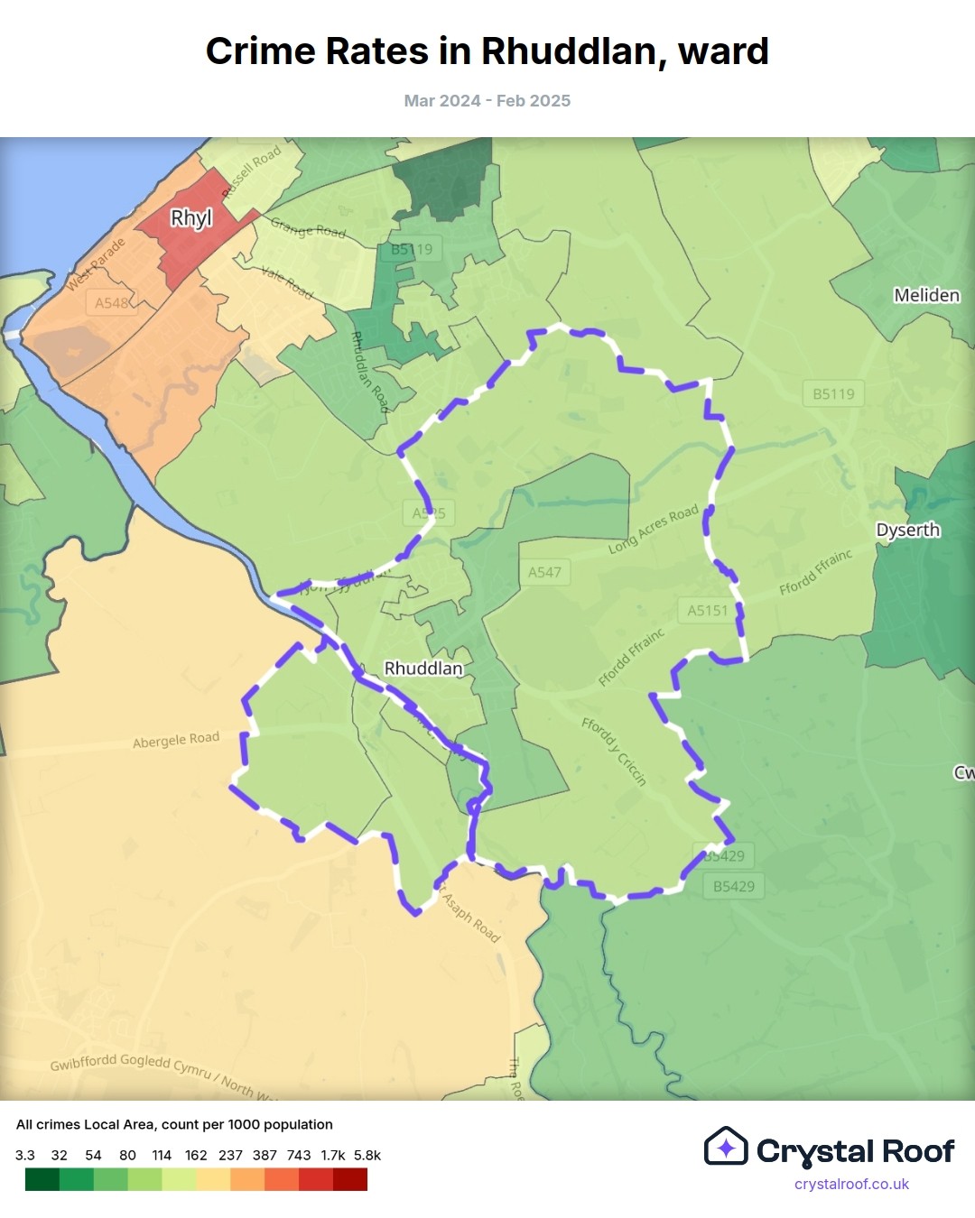 Rhuddlan, (ward) includes areas with the following crime ratings (see map):