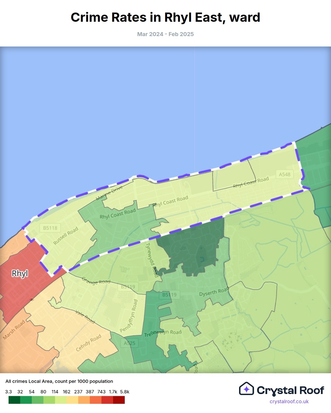 Rhyl East, (ward) includes areas with the following crime ratings (see map):