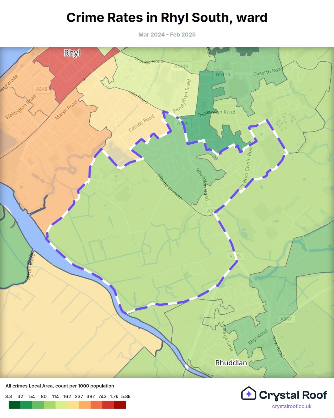 The figures in grey indicate the relative ratings of Rhyl South (ward) for a specific crime type compared to other wards in England and Wales.