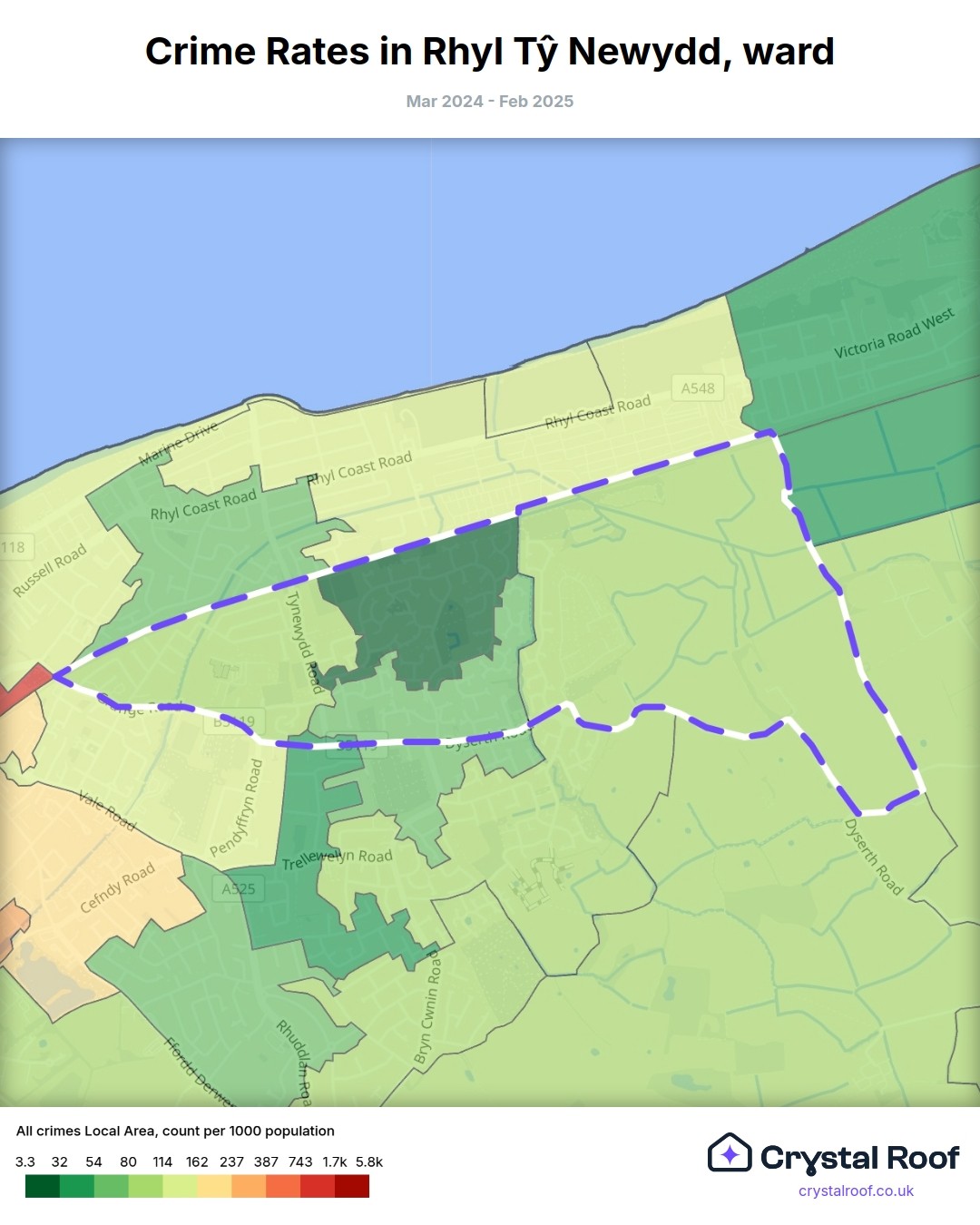 The figures in grey indicate the relative ratings of Rhyl Tŷ Newydd (ward) for a specific crime type compared to other wards in England and Wales.