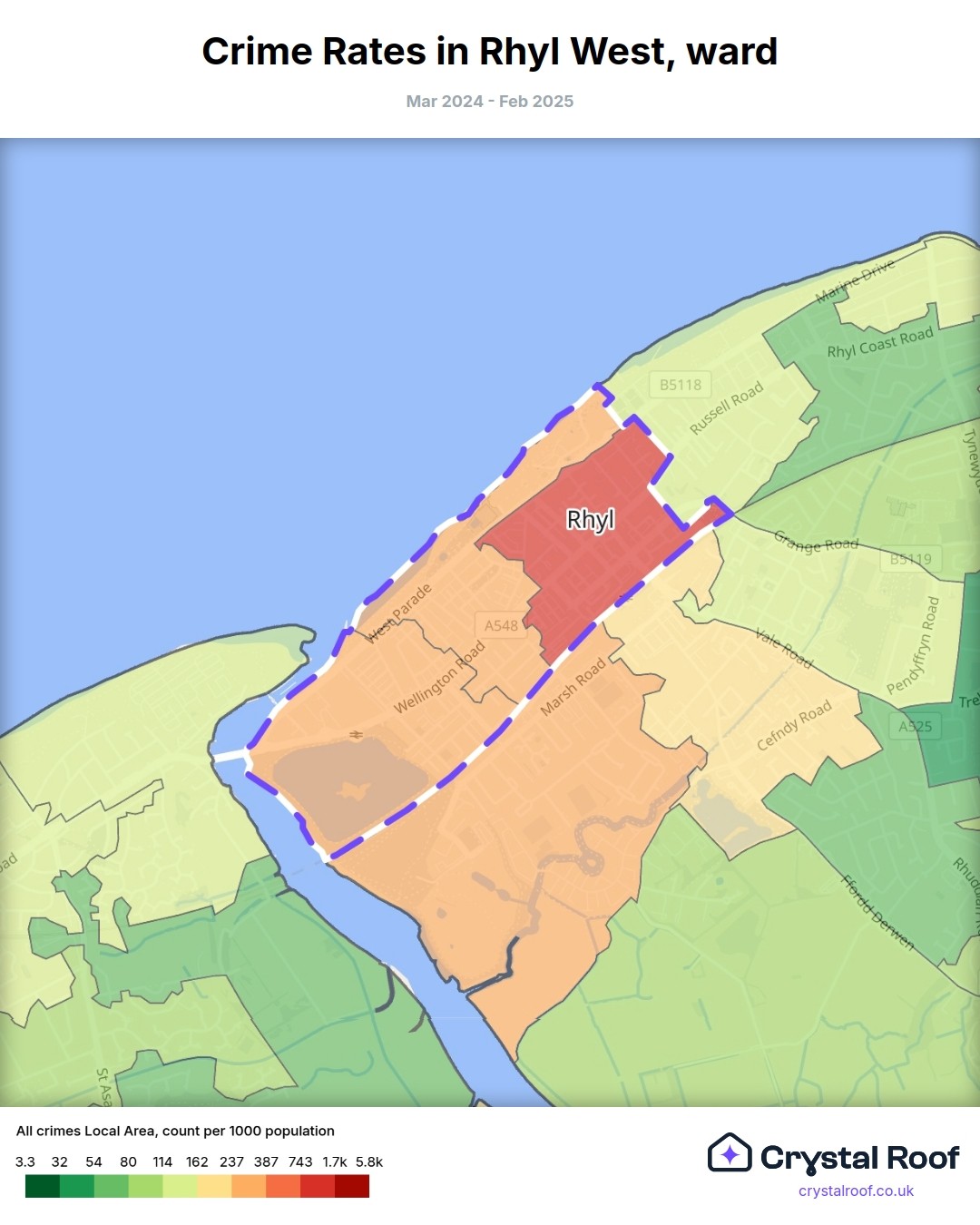 Rhyl West (ward) is located within Denbighshire (borough). Annual total crime rate in Denbighshire (borough) is 116 crimes per thousand resident population, which can be rated as 6 out of 10 or medium crime level compared to other local authority districts in England and Wales.