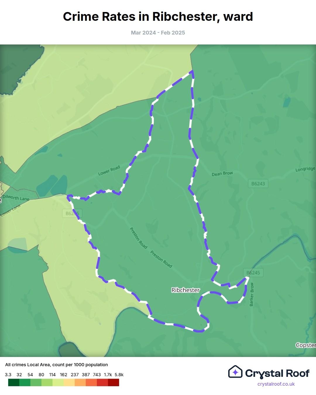 Ribchester, (ward) includes areas with the following crime ratings (see map):
