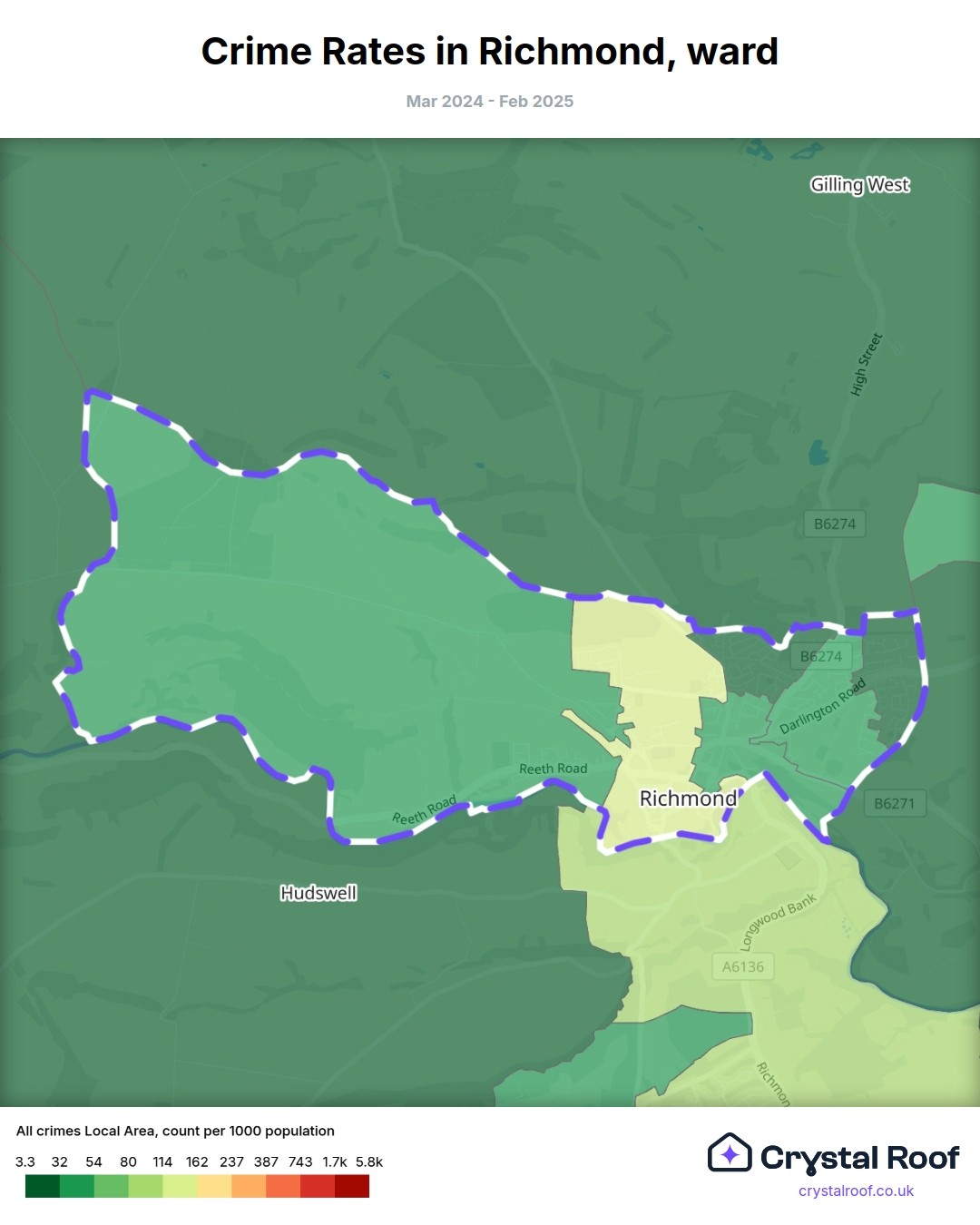 Richmond (ward) is located within North Yorkshire (borough). Annual total crime rate in North Yorkshire (borough) is 48.6 crimes per thousand resident population, which can be rated as 1 out of 10 or low crime level compared to other local authority districts in England and Wales.