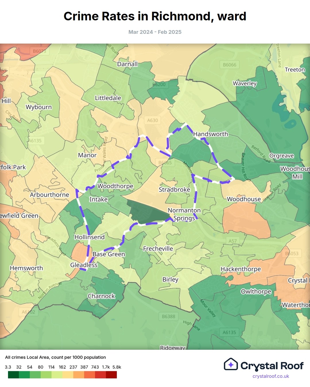 Richmond (ward) is located within Sheffield (borough). Annual total crime rate in Sheffield (borough) is 119 crimes per thousand resident population, which can be rated as 6 out of 10 or medium crime level compared to other local authority districts in England and Wales.