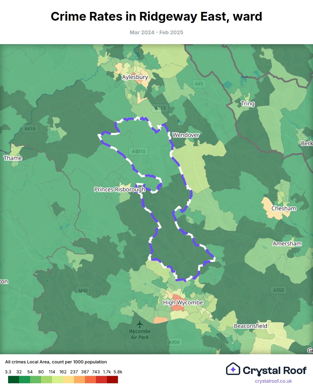 Ridgeway East (ward) is located within Buckinghamshire (borough). Annual total crime rate in Buckinghamshire (borough) is 66.2 crimes per thousand resident population, which can be rated as 2 out of 10 or low crime level compared to other local authority districts in England and Wales.