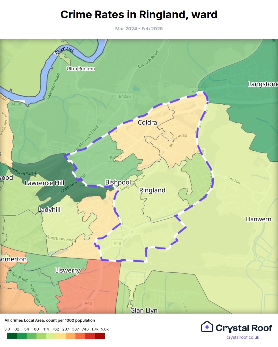 Ringland, (ward) includes areas with the following crime ratings (see map):