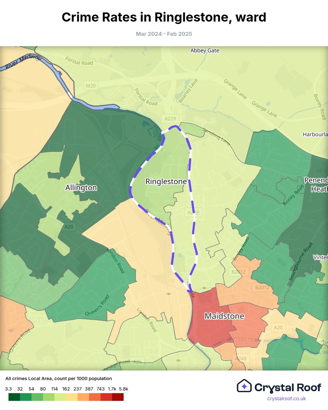 Ringlestone (ward) is located within Maidstone (borough). Annual total crime rate in Maidstone (borough) is 95.1 crimes per thousand resident population, which can be rated as 4 out of 10 or low crime level compared to other local authority districts in England and Wales.