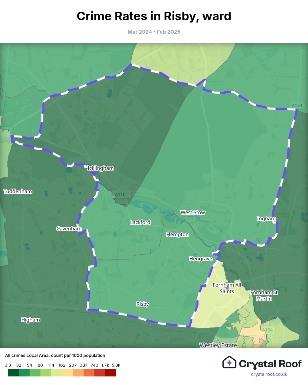 The figures in grey indicate the relative ratings of Risby (ward) for a specific crime type compared to other wards in England and Wales.