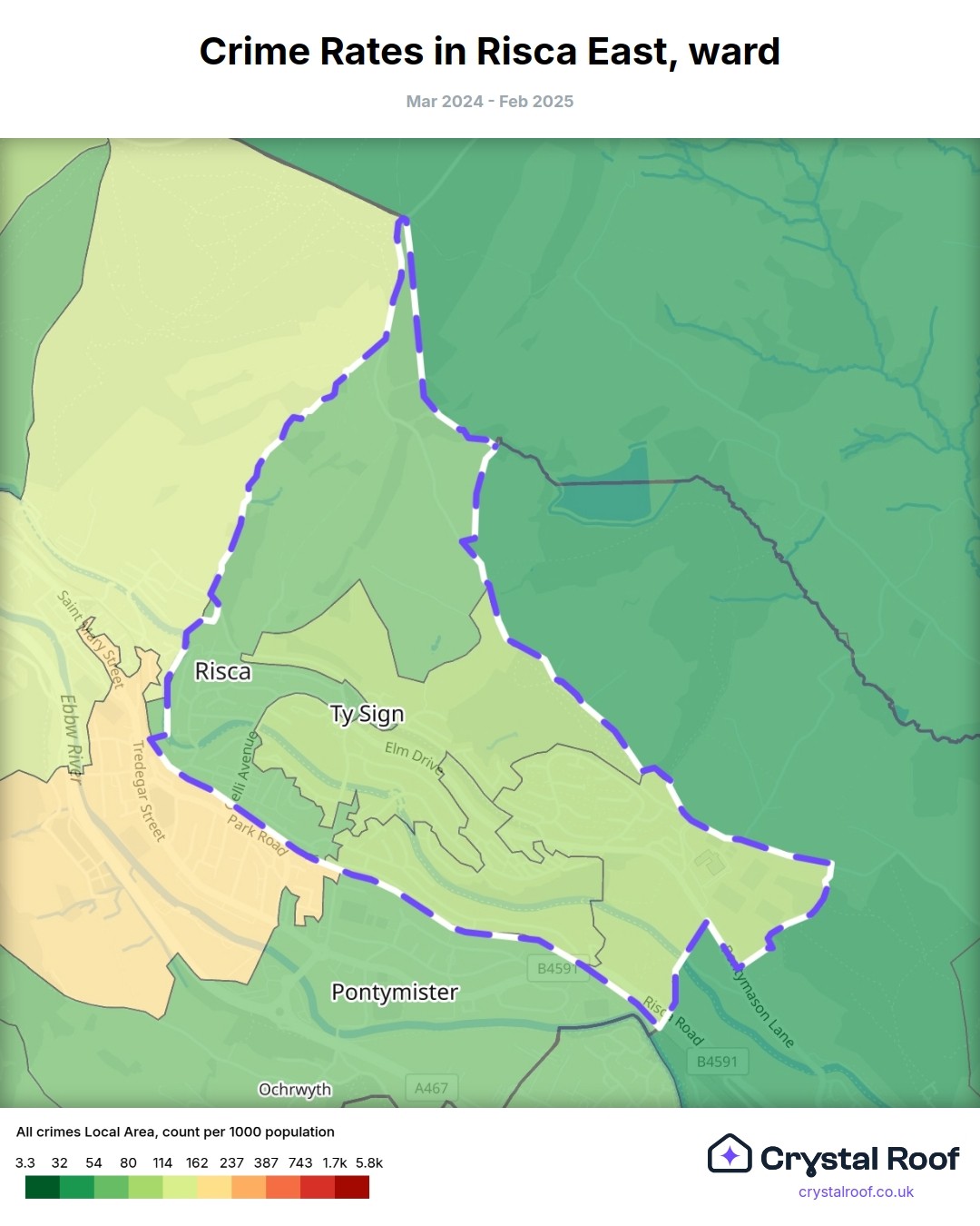 The figures in grey indicate the relative ratings of Risca East (ward) for a specific crime type compared to other wards in England and Wales.