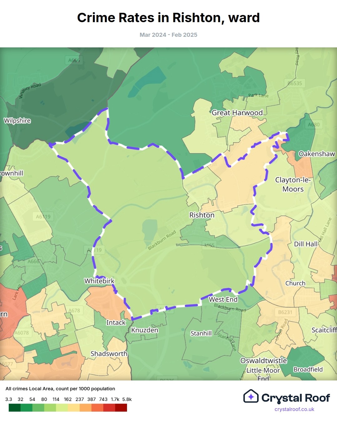 Rishton, (ward) includes areas with the following crime ratings (see map):