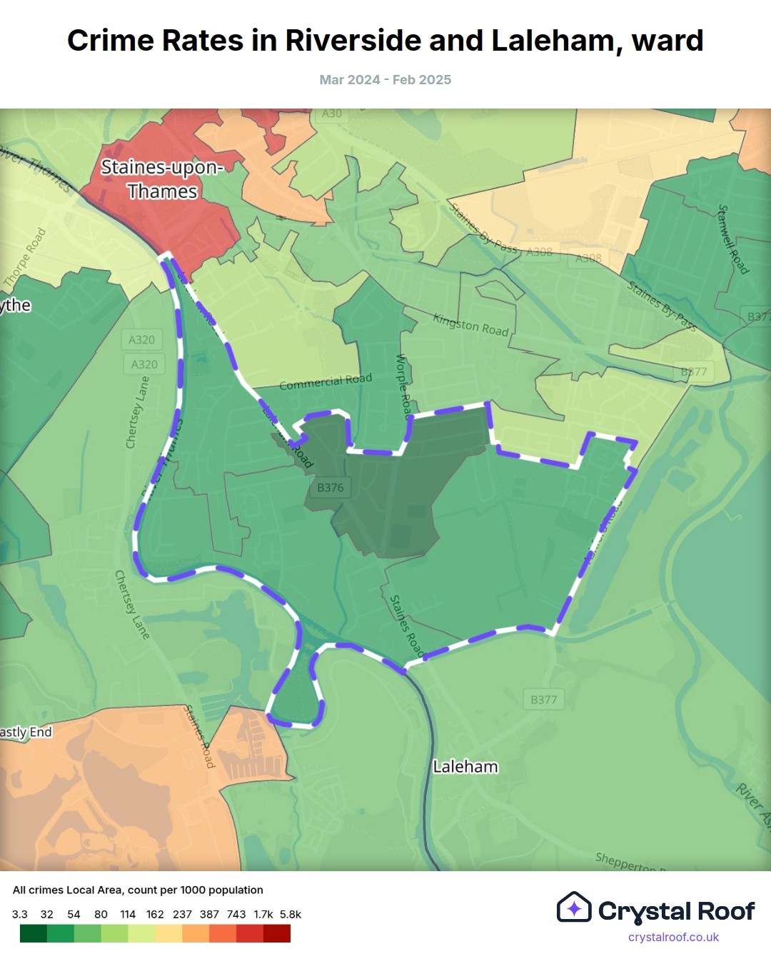 Riverside and Laleham, (ward) includes areas with the following crime ratings (see map):