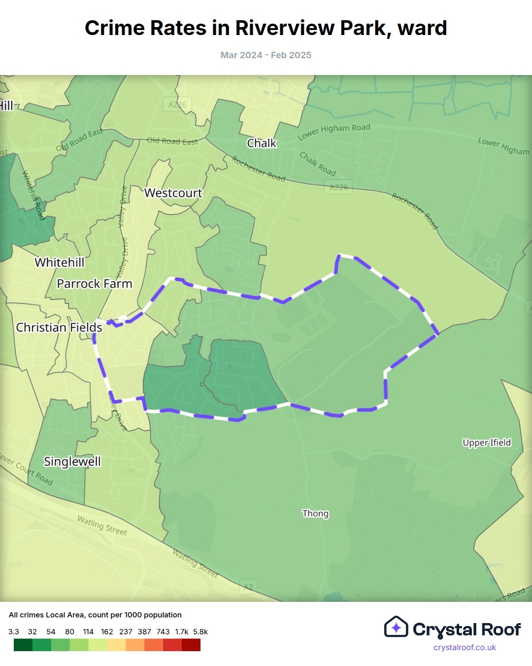 Riverview Park (ward) is located within Gravesham (borough). Annual total crime rate in Gravesham (borough) is 106 crimes per thousand resident population, which can be rated as 5 out of 10 or medium crime level compared to other local authority districts in England and Wales.