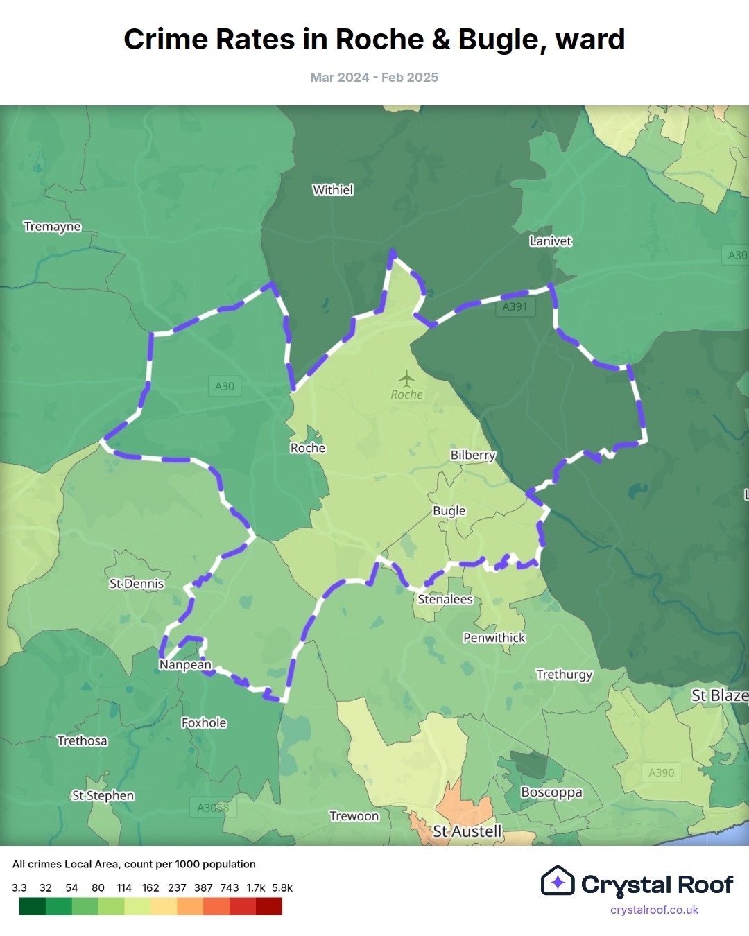 Roche & Bugle, (ward) includes areas with the following crime ratings (see map):