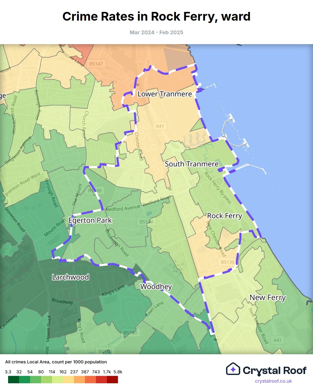 Rock Ferry, (ward) includes areas with the following crime ratings (see map):