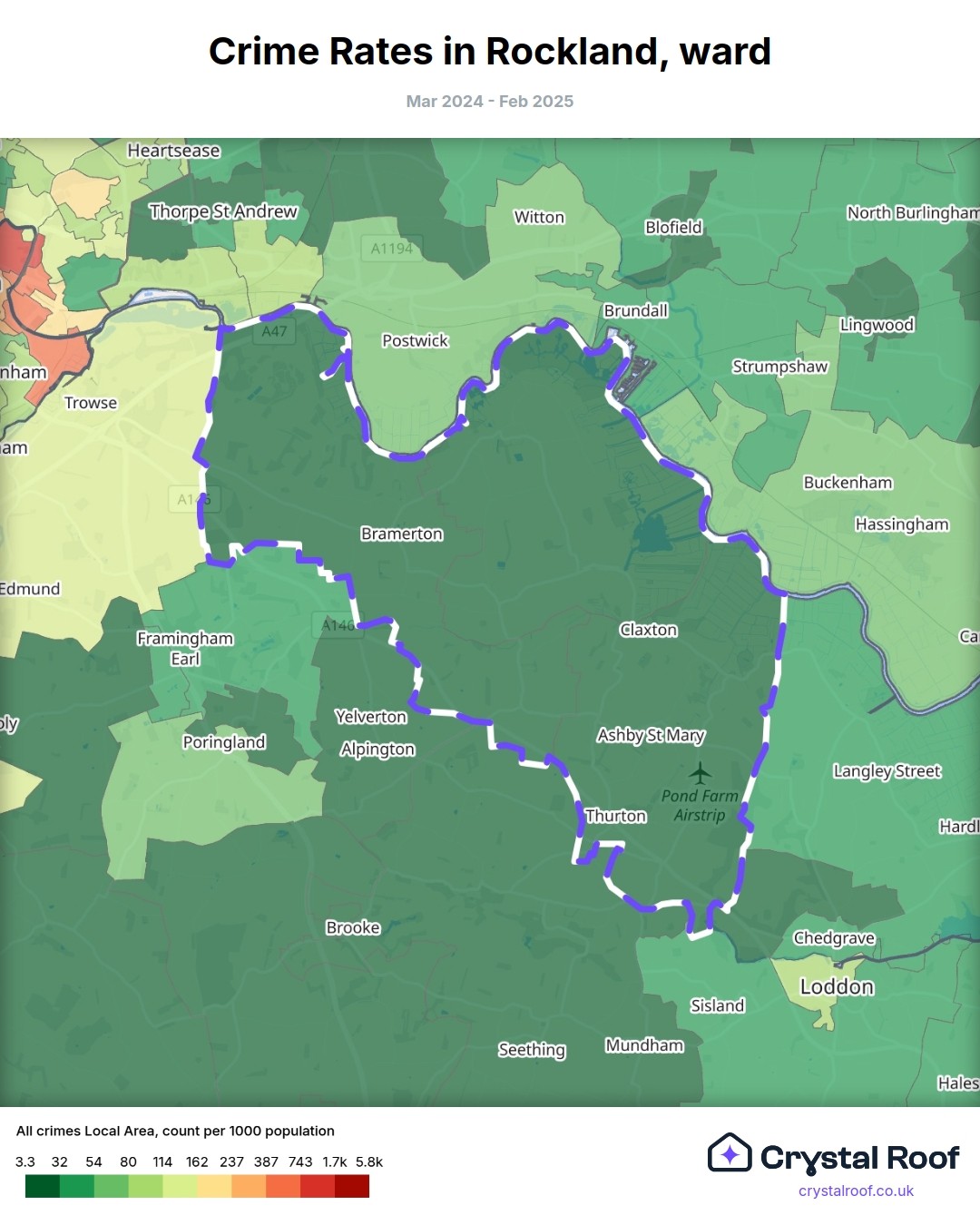 Rockland (ward) is located within South Norfolk (borough). Annual total crime rate in South Norfolk (borough) is 51.1 crimes per thousand resident population, which can be rated as 1 out of 10 or low crime level compared to other local authority districts in England and Wales.