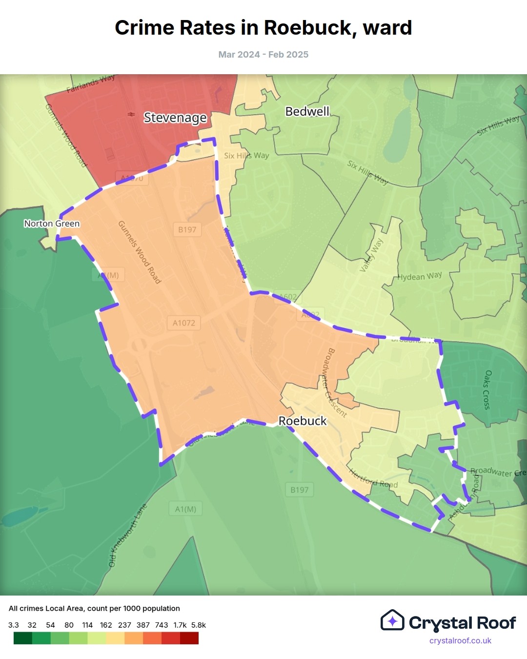 Roebuck (ward) is located within Stevenage (borough). Annual total crime rate in Stevenage (borough) is 111 crimes per thousand resident population, which can be rated as 5 out of 10 or medium crime level compared to other local authority districts in England and Wales.
