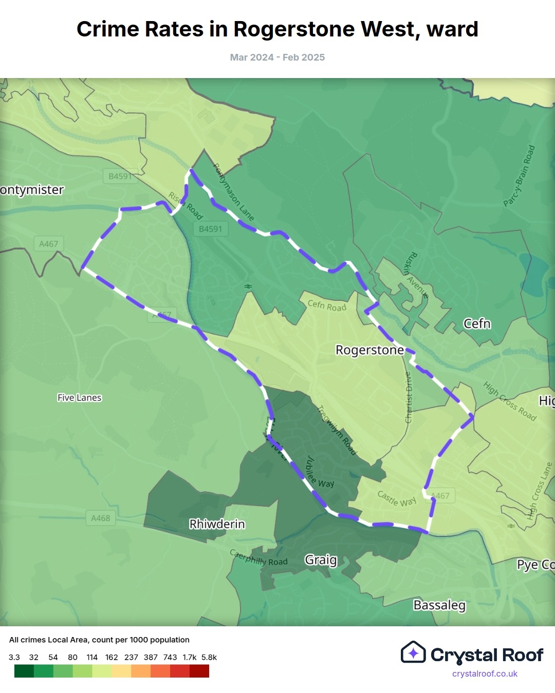 The figures in grey indicate the relative ratings of Rogerstone West (ward) for a specific crime type compared to other wards in England and Wales.