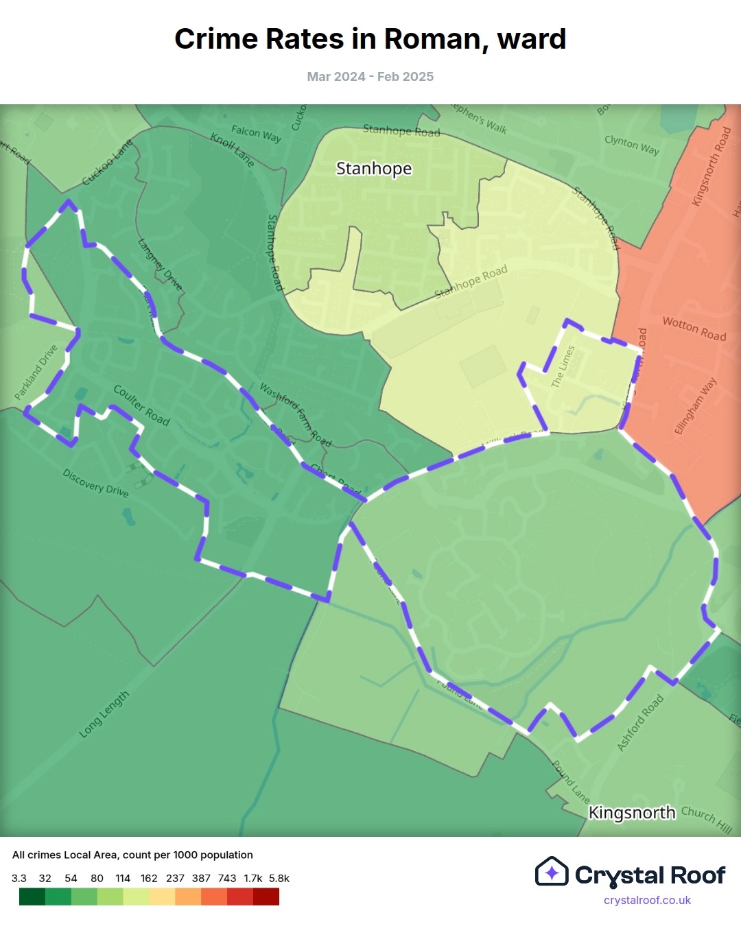 Roman (ward) is located within Ashford (borough). Annual total crime rate in Ashford (borough) is 82.8 crimes per thousand resident population, which can be rated as 3 out of 10 or low crime level compared to other local authority districts in England and Wales.