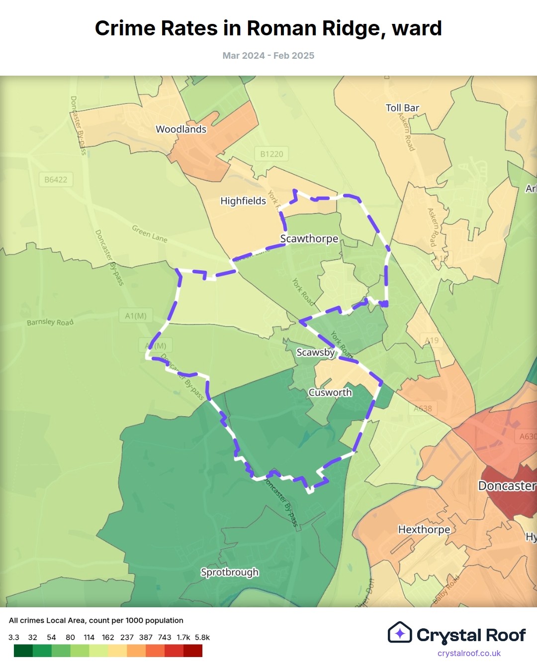 Roman Ridge (ward) is located within Doncaster (borough). Annual total crime rate in Doncaster (borough) is 139 crimes per thousand resident population, which can be rated as 7 out of 10 or high crime level compared to other local authority districts in England and Wales.