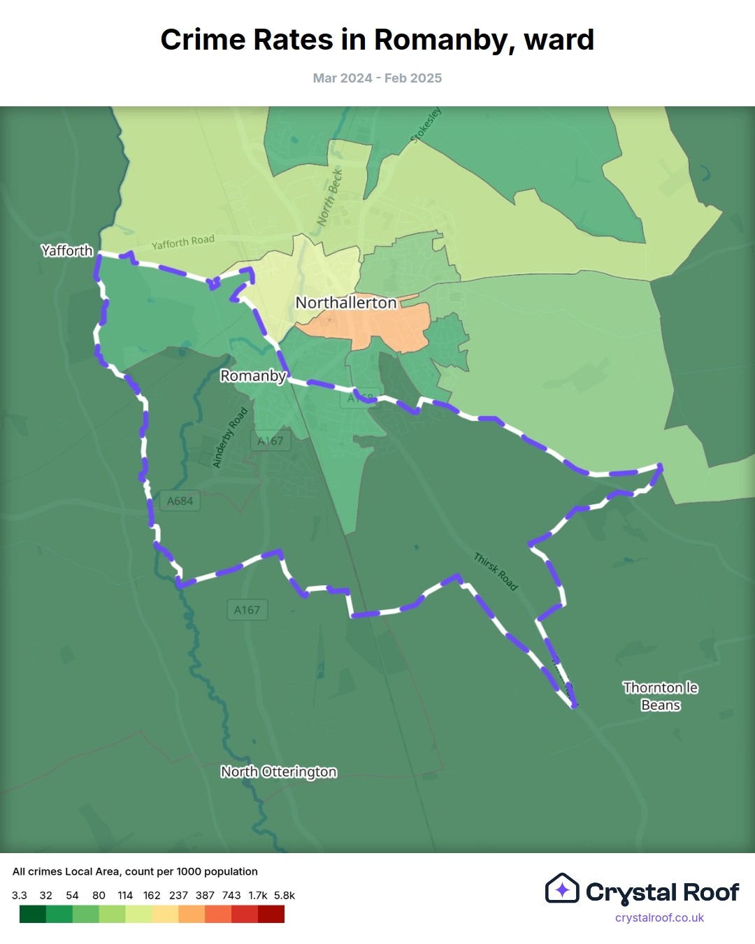 The figures in grey indicate the relative ratings of Romanby (ward) for a specific crime type compared to other wards in England and Wales.