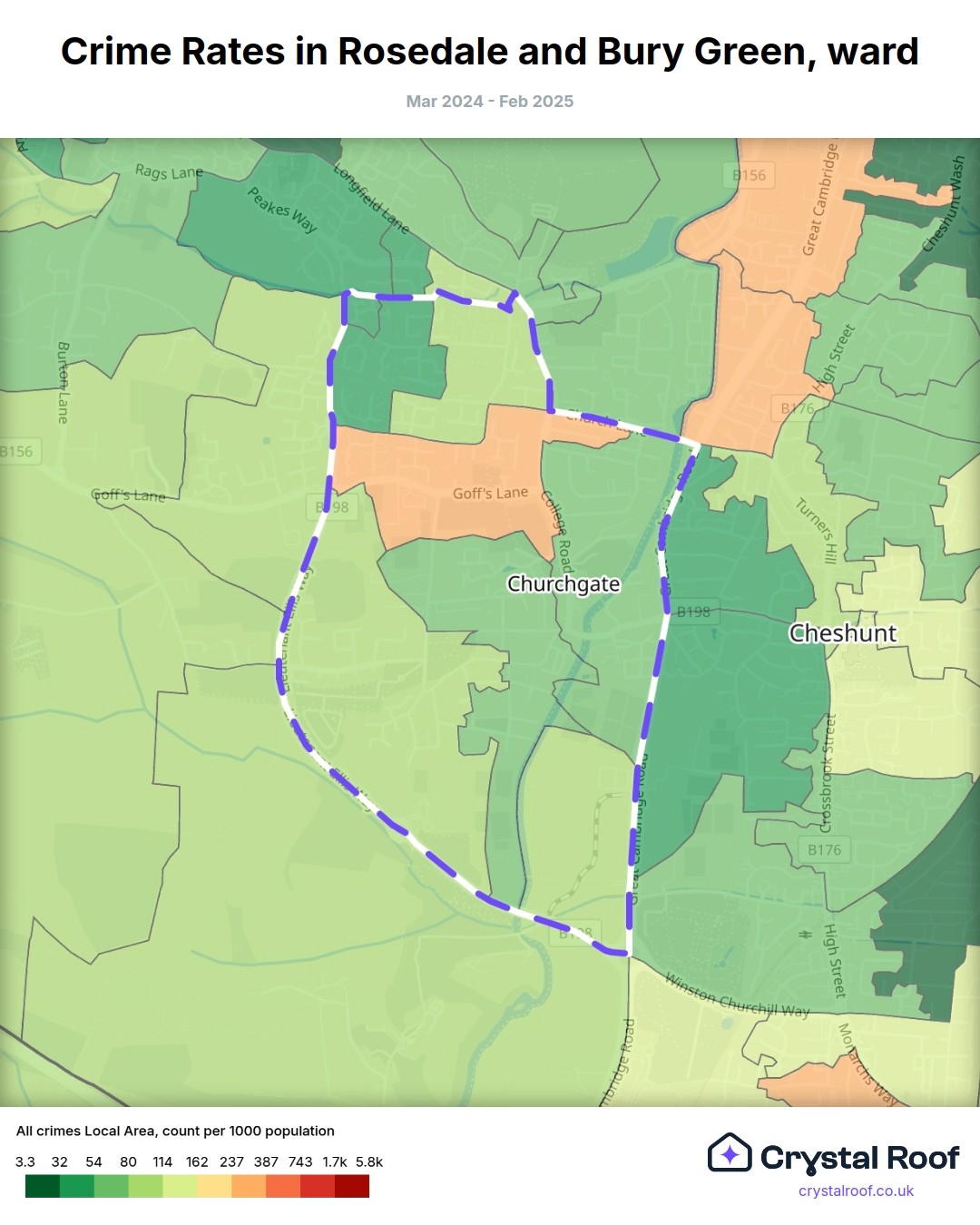 Rosedale and Bury Green, (ward) includes areas with the following crime ratings (see map):