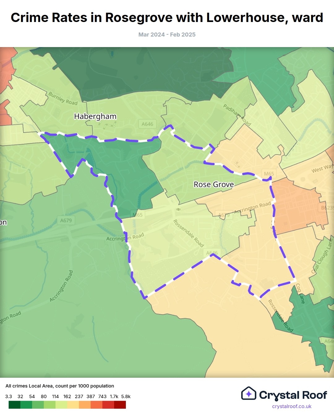Rosegrove with Lowerhouse, (ward) includes areas with the following crime ratings (see map):