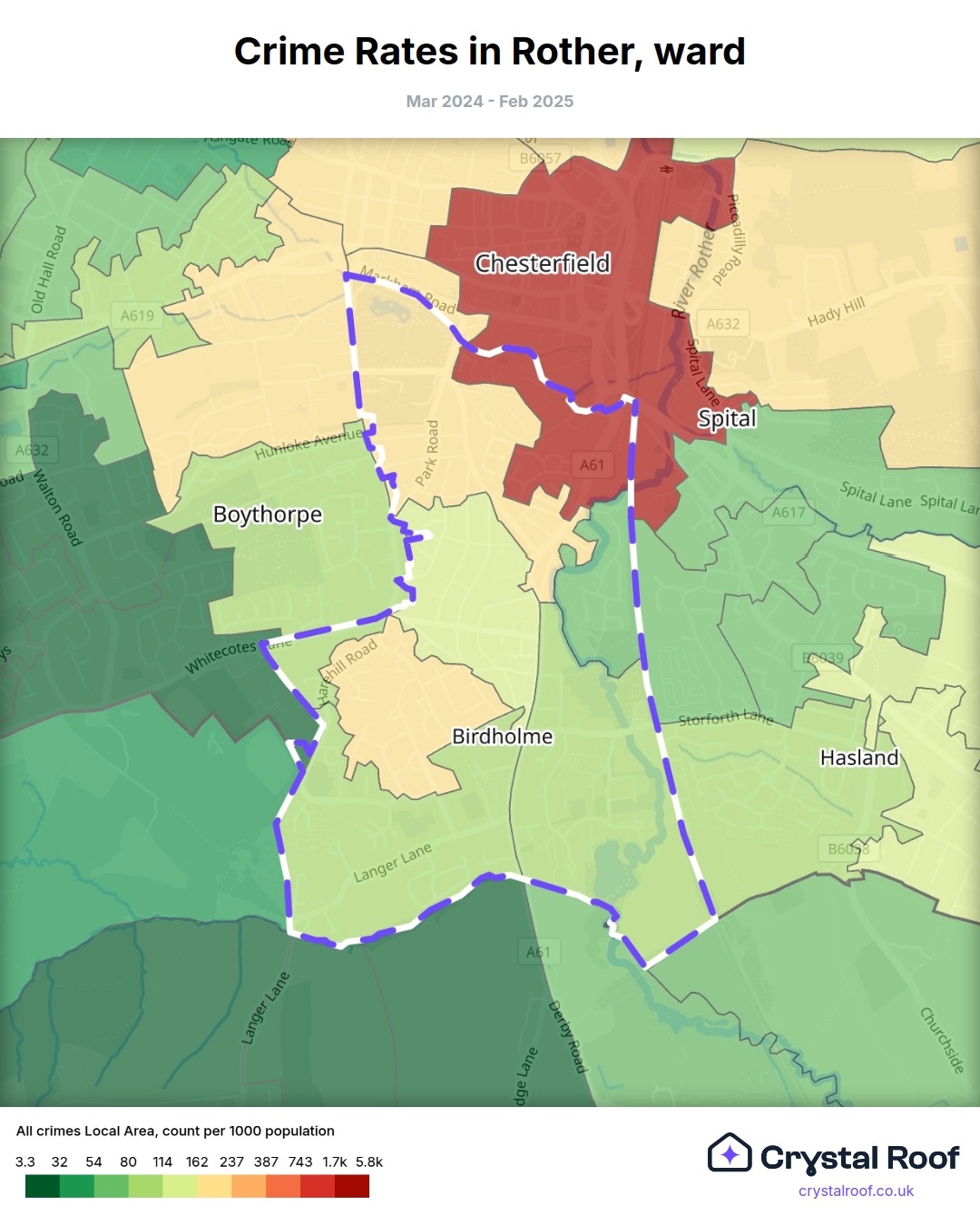 Rother (ward) is located within Chesterfield (borough). Annual total crime rate in Chesterfield (borough) is 121 crimes per thousand resident population, which can be rated as 6 out of 10 or medium crime level compared to other local authority districts in England and Wales.