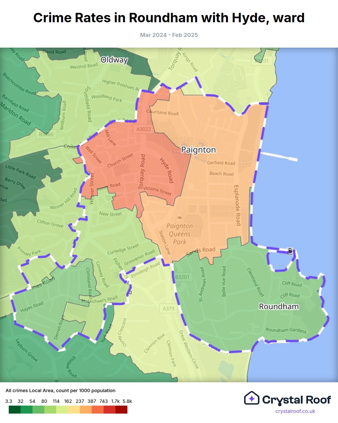 Roundham with Hyde (ward) is located within Torbay (borough). Annual total crime rate in Torbay (borough) is 111 crimes per thousand resident population, which can be rated as 5 out of 10 or medium crime level compared to other local authority districts in England and Wales.