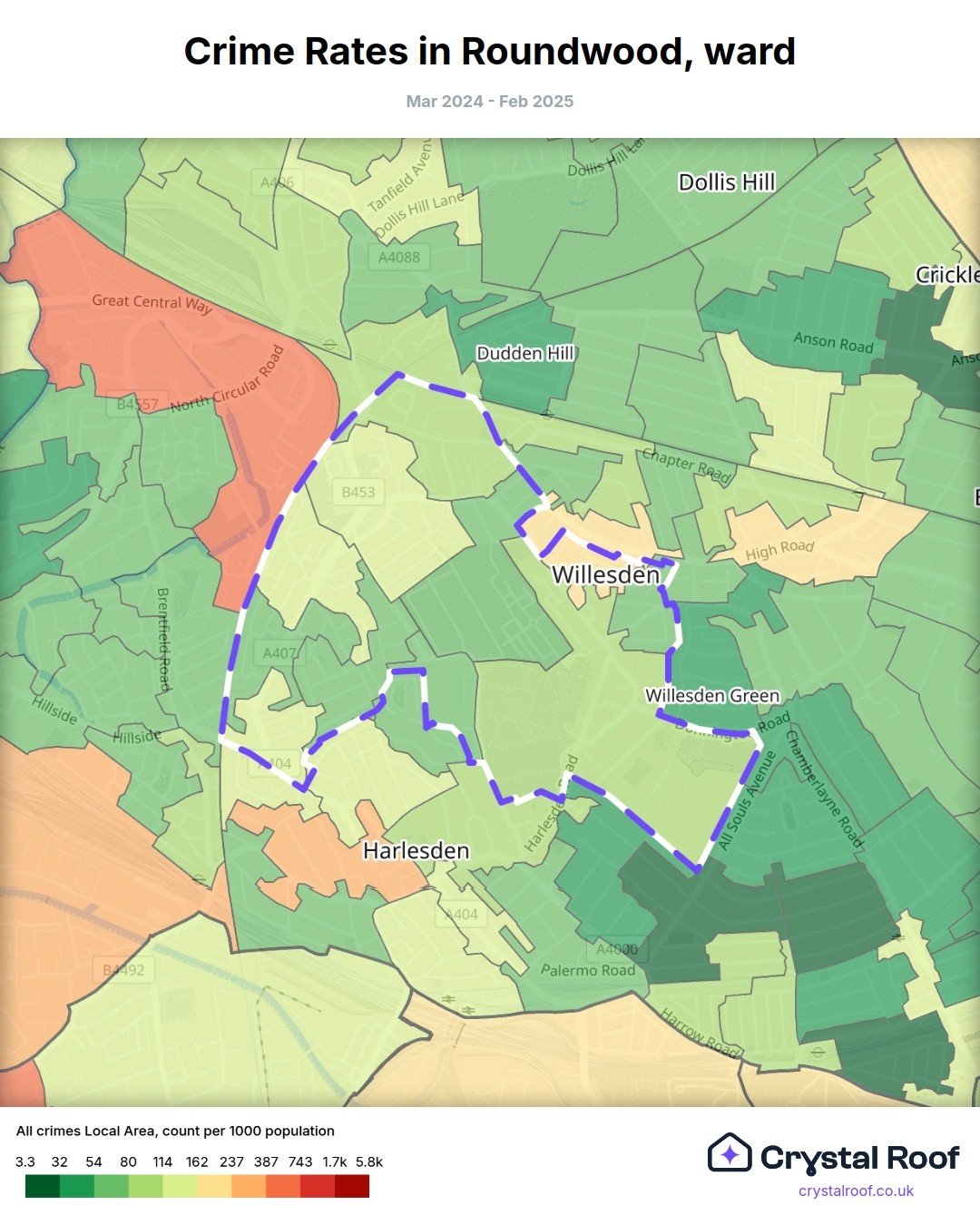 Roundwood (ward) is located within Brent (borough). Annual total crime rate in Brent (borough) is 126 crimes per thousand resident population, which can be rated as 6 out of 10 or medium crime level compared to other local authority districts in England and Wales.