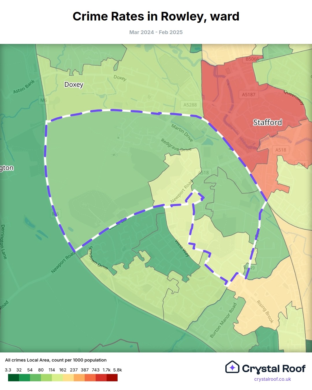 Rowley (ward) is located within Stafford (borough). Annual total crime rate in Stafford (borough) is 74.9 crimes per thousand resident population, which can be rated as 3 out of 10 or low crime level compared to other local authority districts in England and Wales.