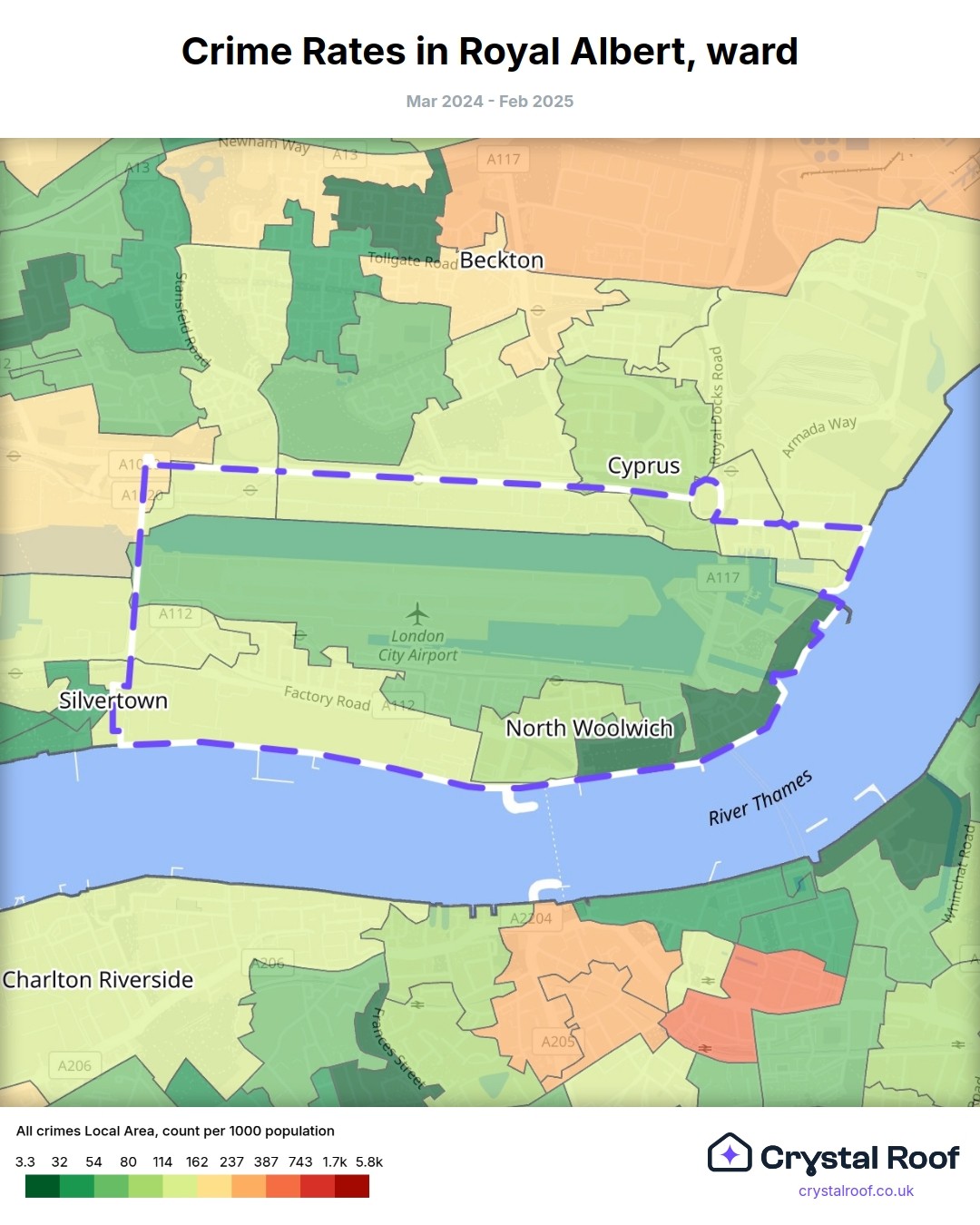 Royal Albert, (ward) includes areas with the following crime ratings (see map):
