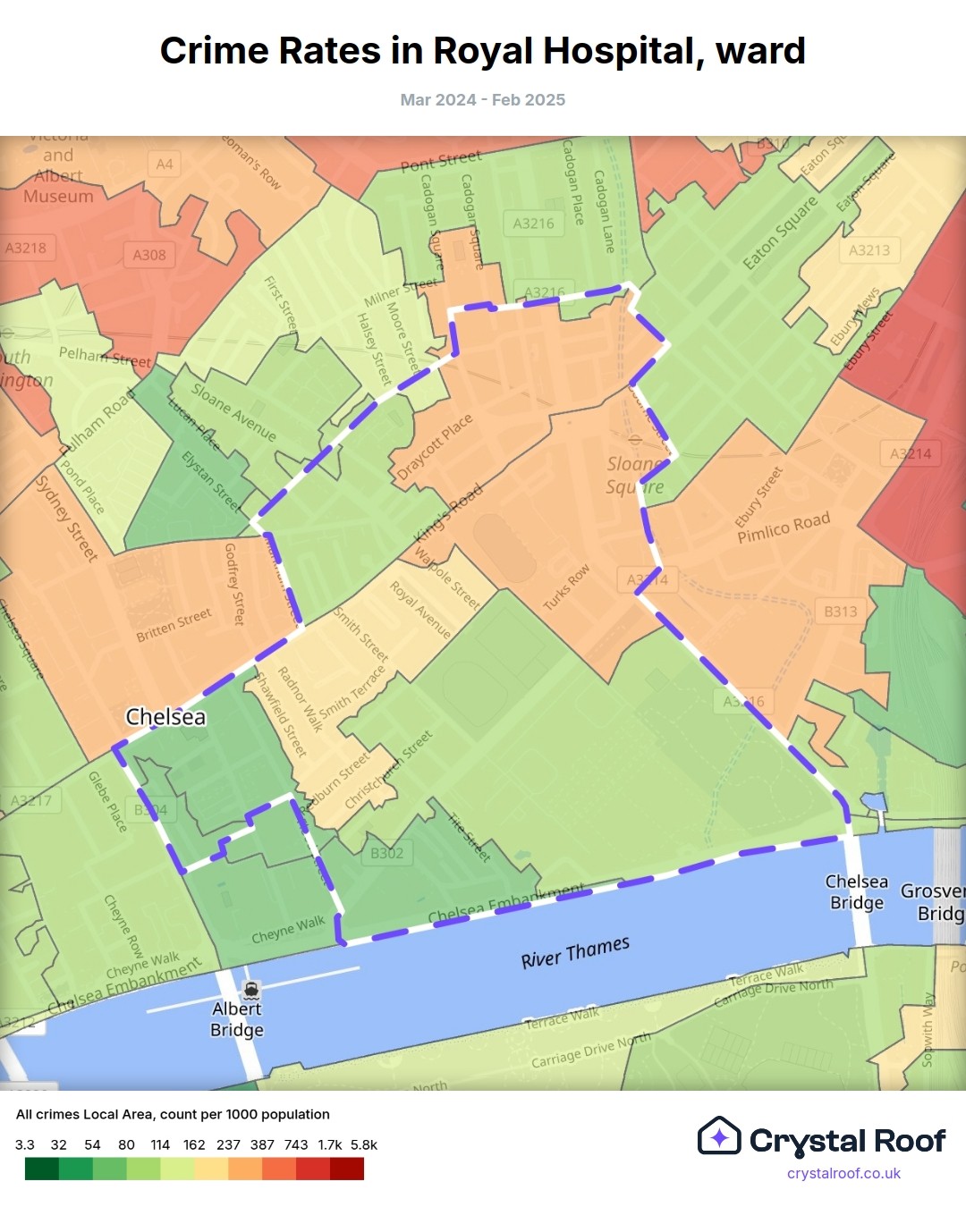 Royal Hospital (ward) is located within Kensington and Chelsea (borough). Annual total crime rate in Kensington and Chelsea (borough) is 192 crimes per thousand resident population, which can be rated as 8 out of 10 or high crime level compared to other local authority districts in England and Wales.