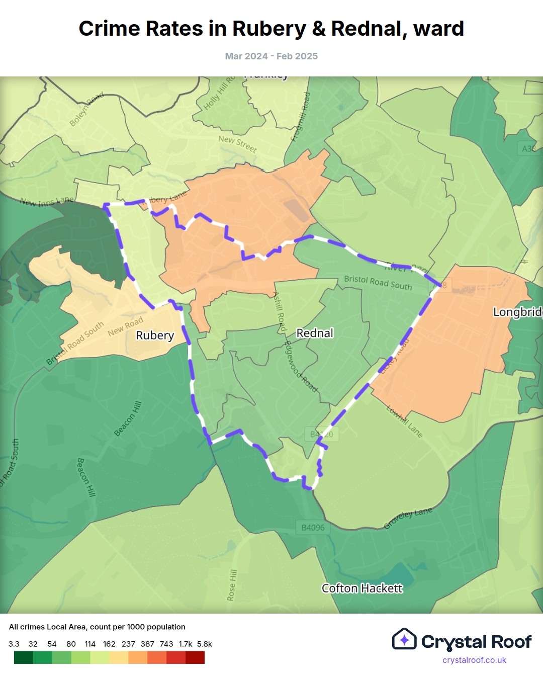 Rubery & Rednal, (ward) includes areas with the following crime ratings (see map):