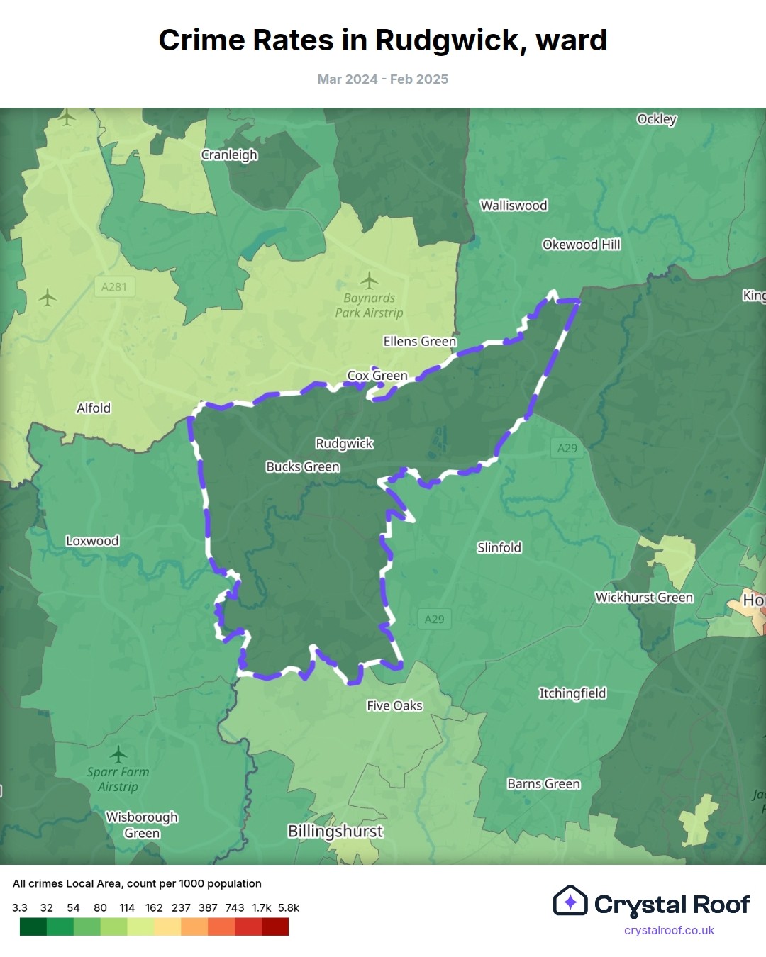 Rudgwick, (ward) includes areas with the following crime ratings (see map):