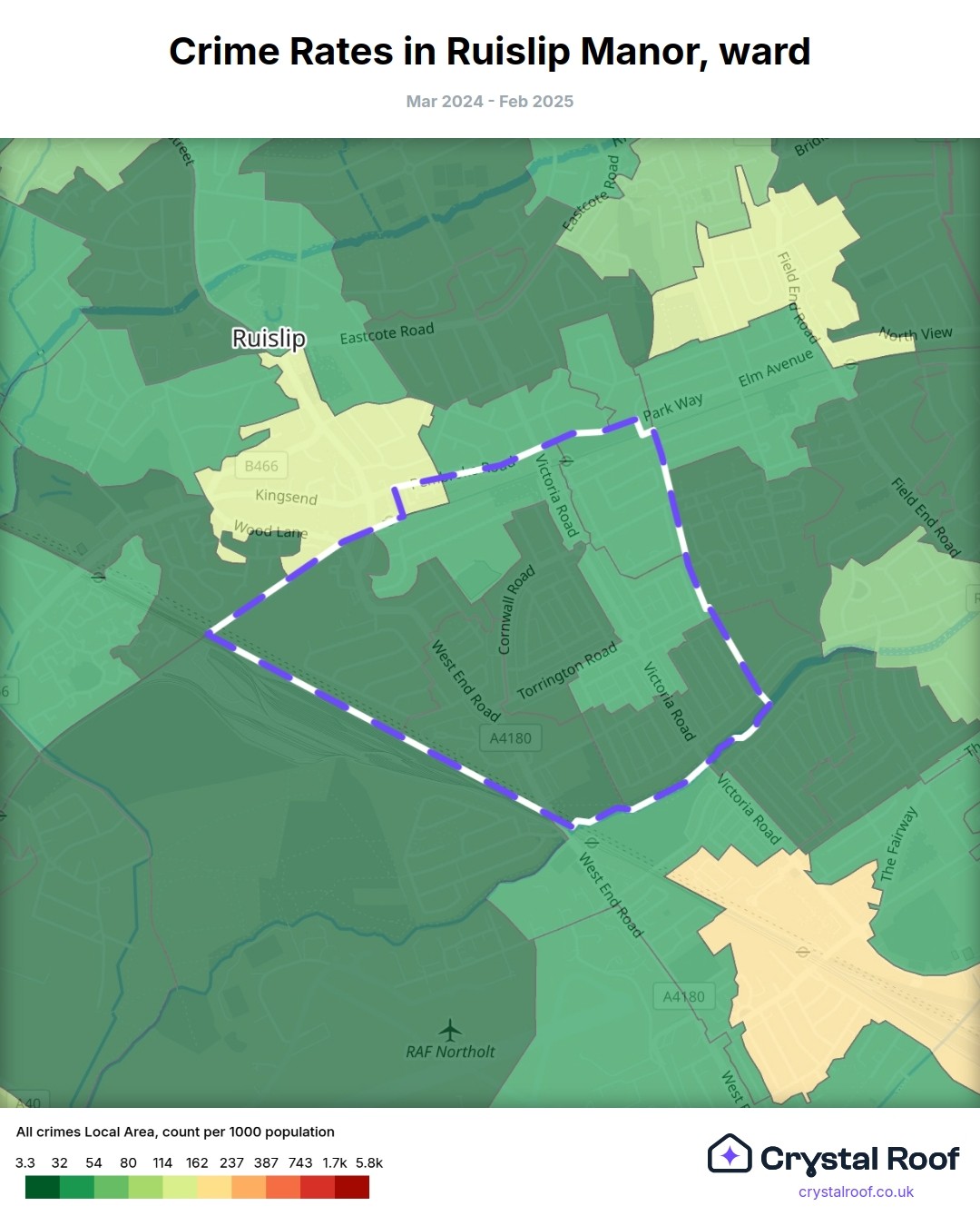 The figures in grey indicate the relative ratings of Ruislip Manor (ward) for a specific crime type compared to other wards in England and Wales.