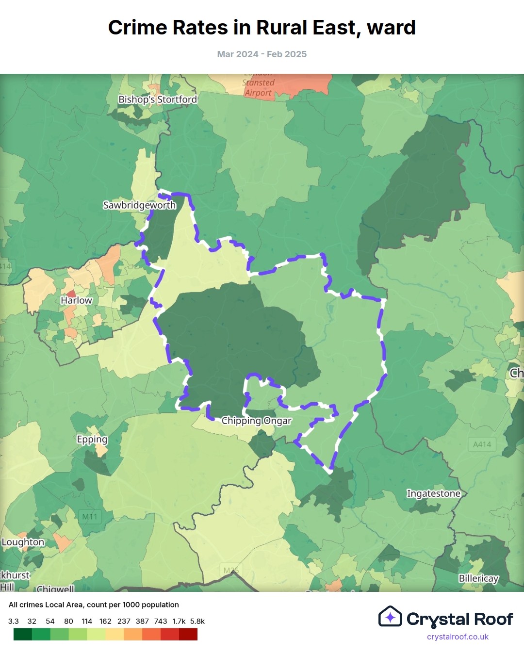 Rural East (ward) is located within Epping Forest (borough). Annual total crime rate in Epping Forest (borough) is 76.6 crimes per thousand resident population, which can be rated as 3 out of 10 or low crime level compared to other local authority districts in England and Wales.