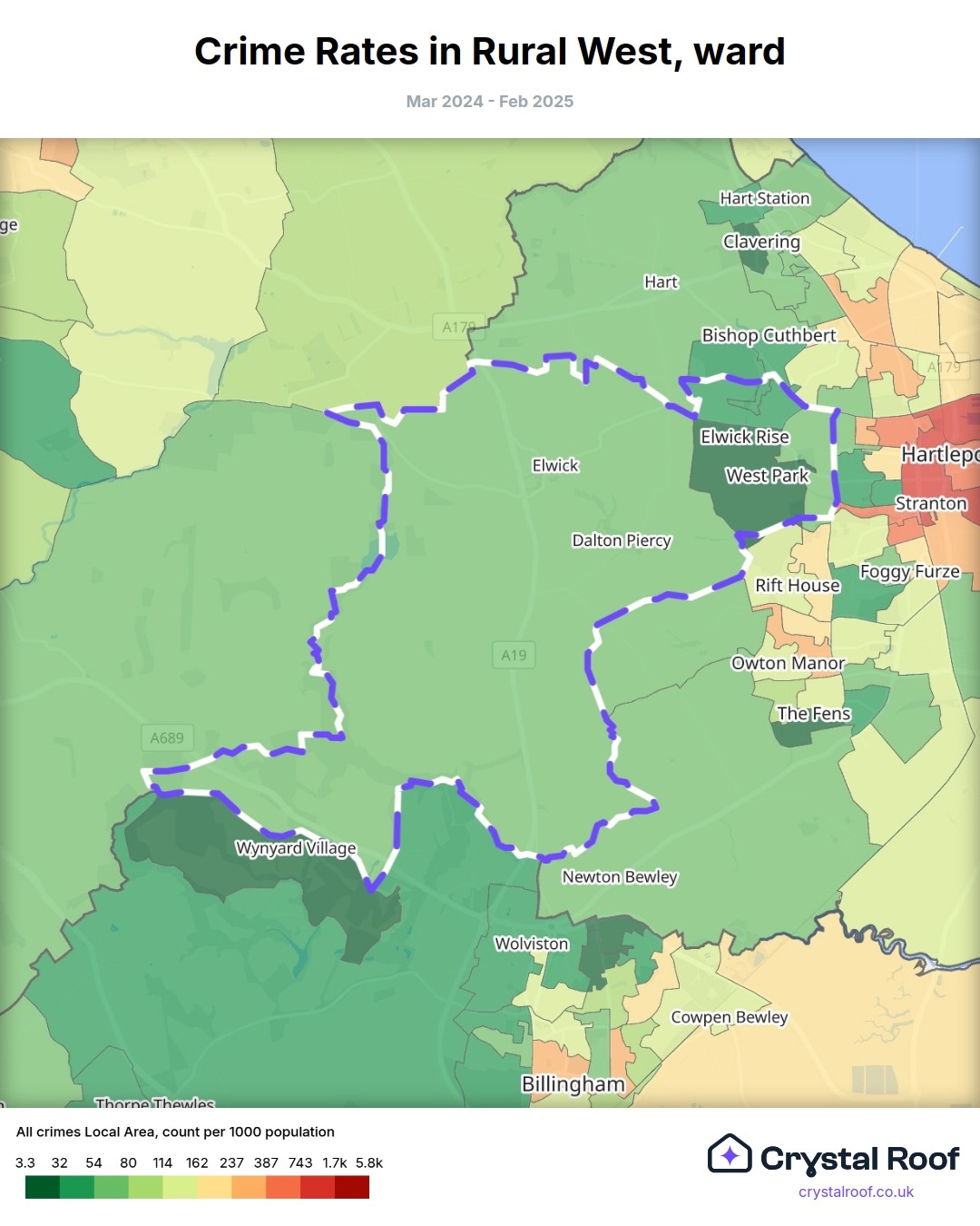 Rural West (ward) is located within Hartlepool (borough). Annual total crime rate in Hartlepool (borough) is 171 crimes per thousand resident population, which can be rated as 8 out of 10 or high crime level compared to other local authority districts in England and Wales.