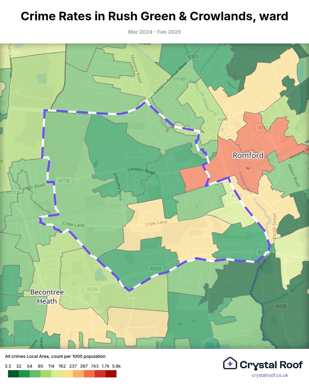 Rush Green & Crowlands, (ward) includes areas with the following crime ratings (see map):