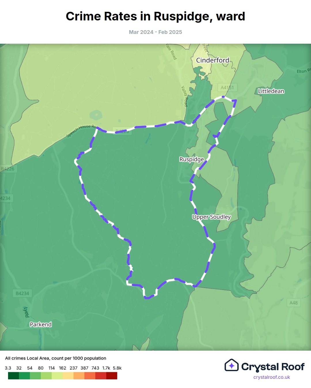 Ruspidge, (ward) includes areas with the following crime ratings (see map):