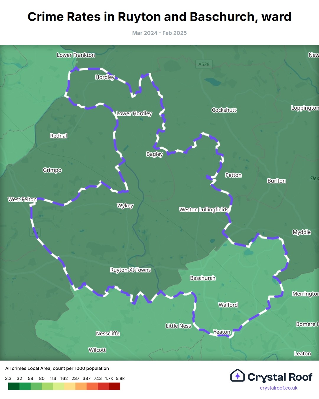 Ruyton & Baschurch, (ward) includes areas with the following crime ratings (see map):