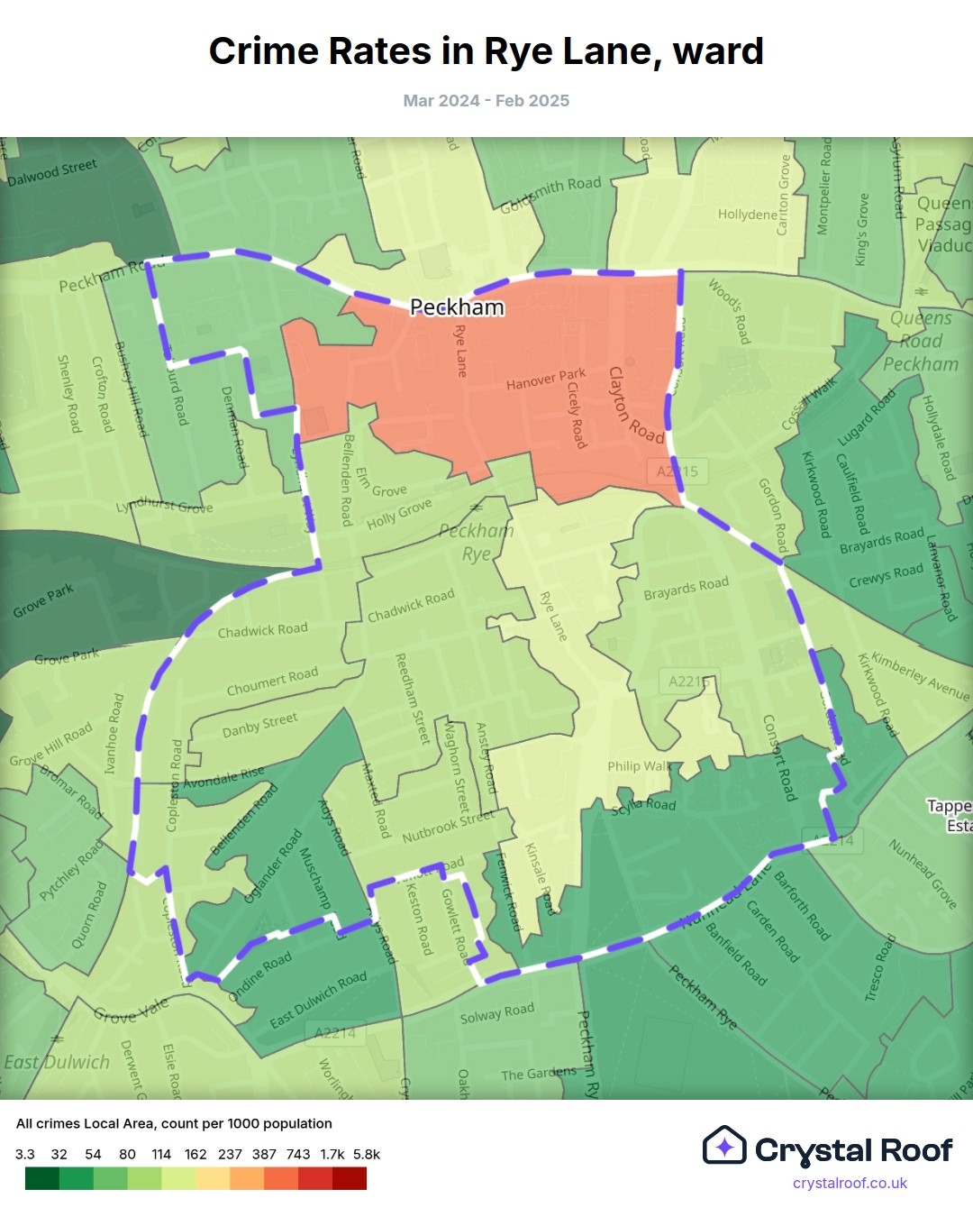 Rye Lane, (ward) includes areas with the following crime ratings (see map):