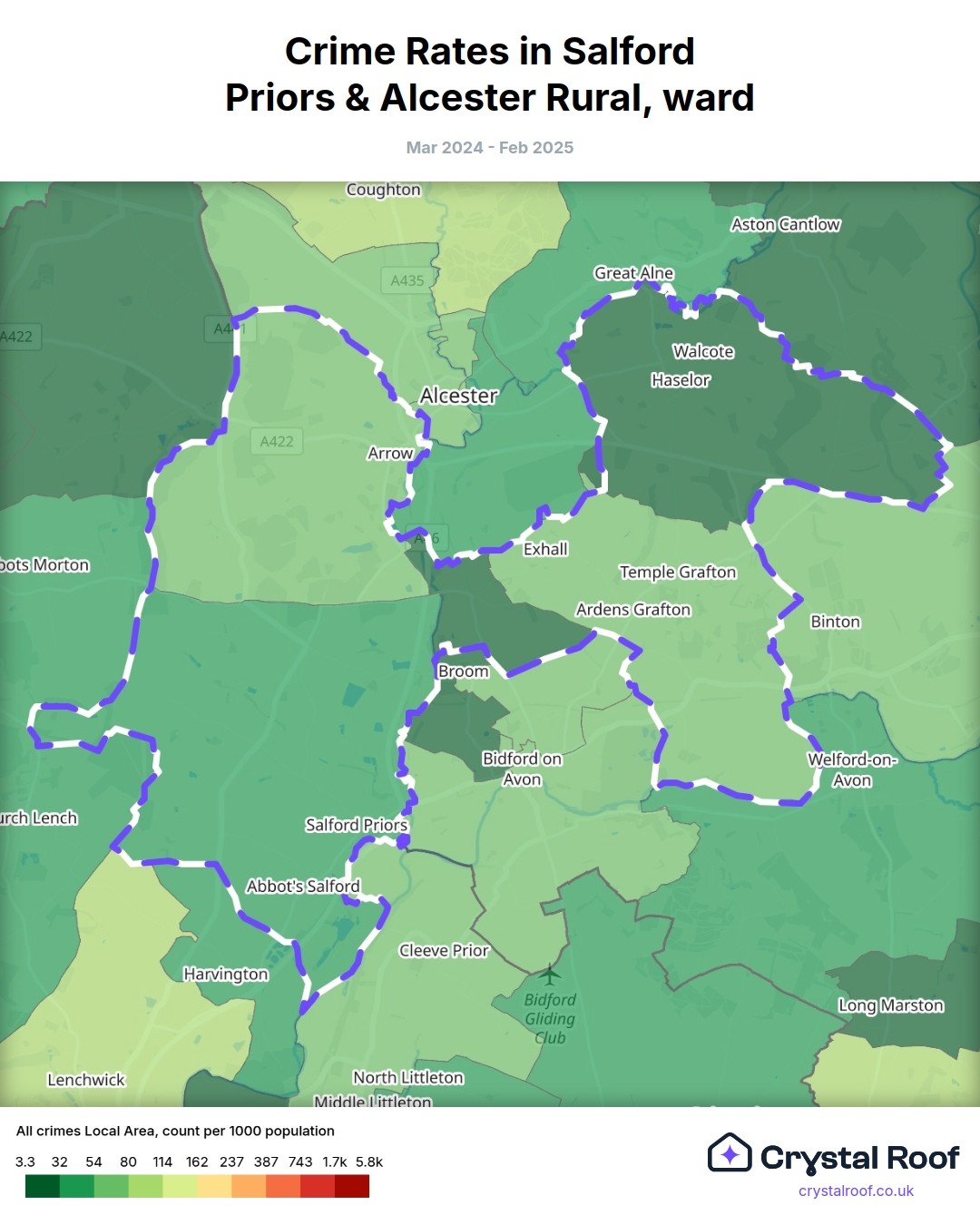 Salford Priors & Alcester Rural, (ward) includes areas with the following crime ratings (see map):