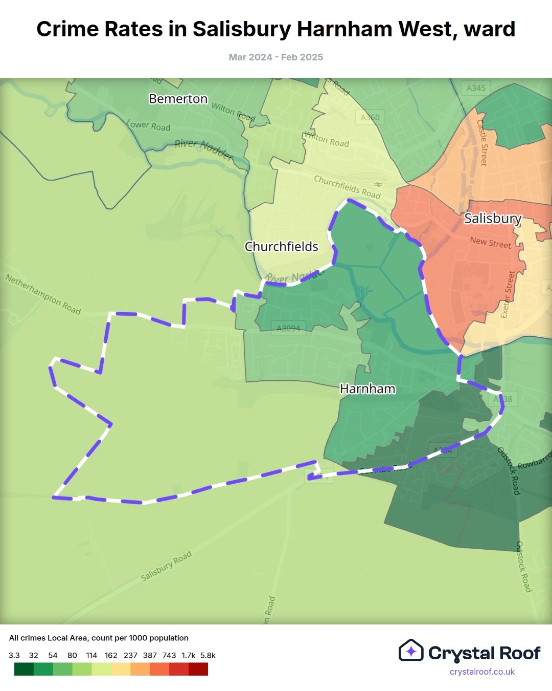 Salisbury Harnham West, (ward) includes areas with the following crime ratings (see map):