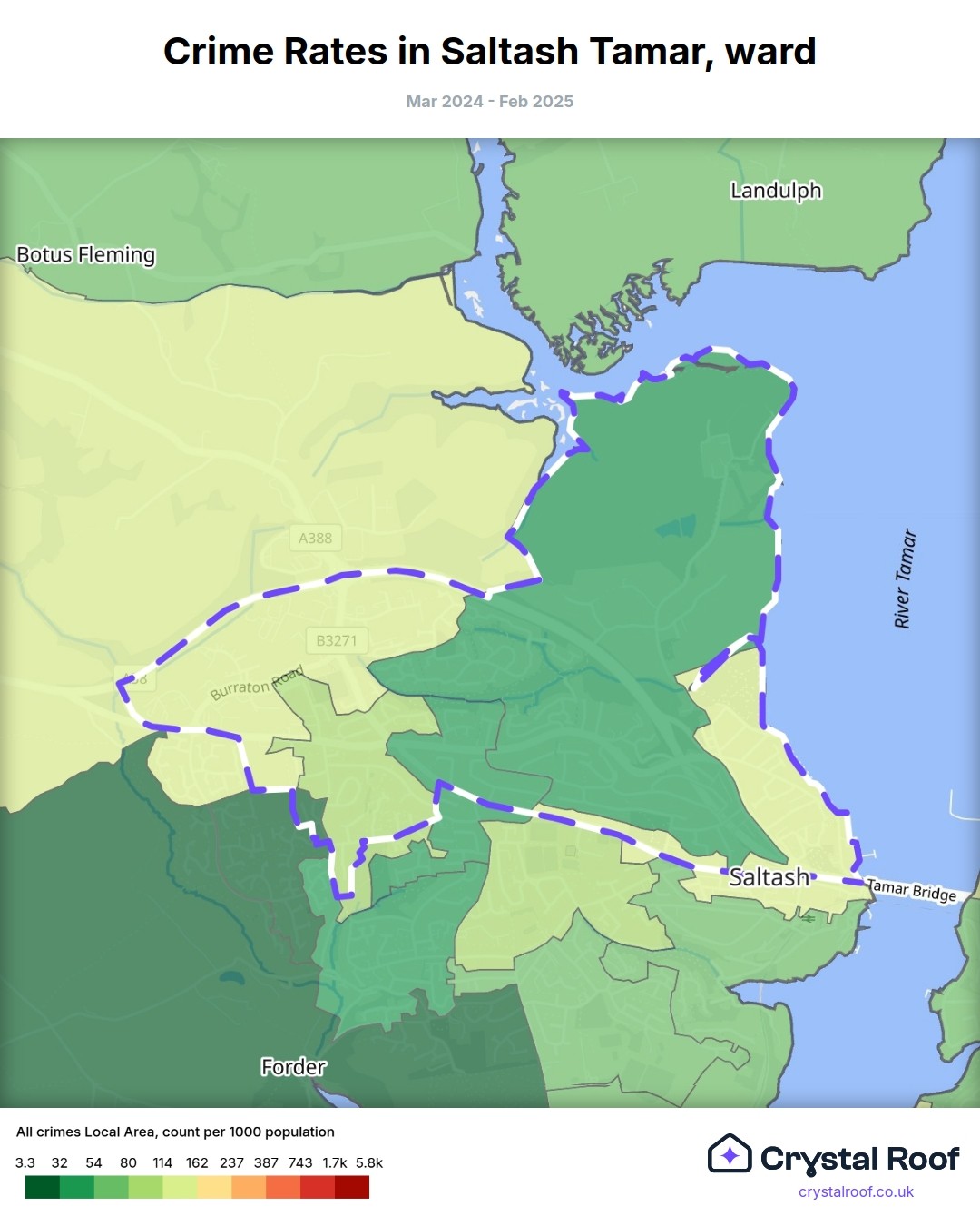 Saltash Tamar, (ward) includes areas with the following crime ratings (see map):