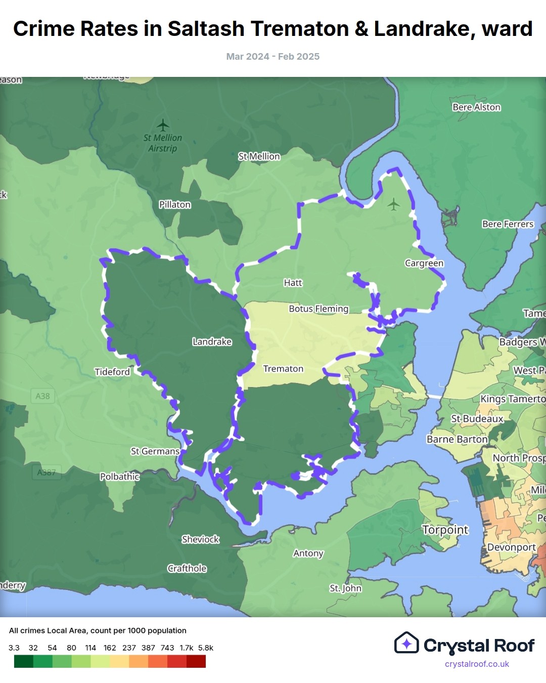 Saltash Trematon & Landrake, (ward) includes areas with the following crime ratings (see map):