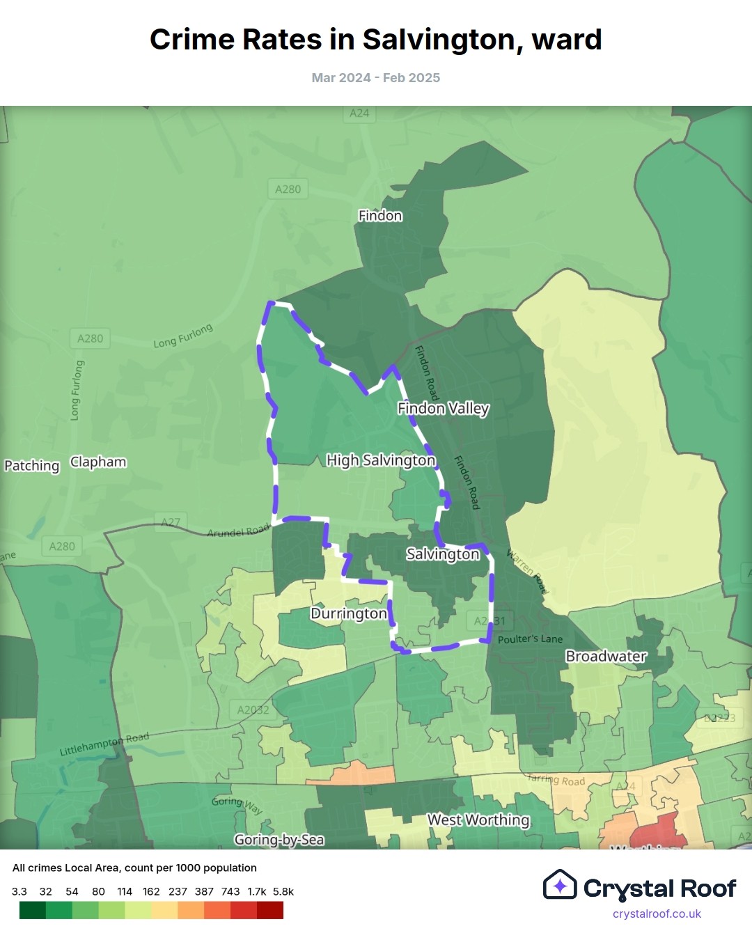 Salvington, (ward) includes areas with the following crime ratings (see map):