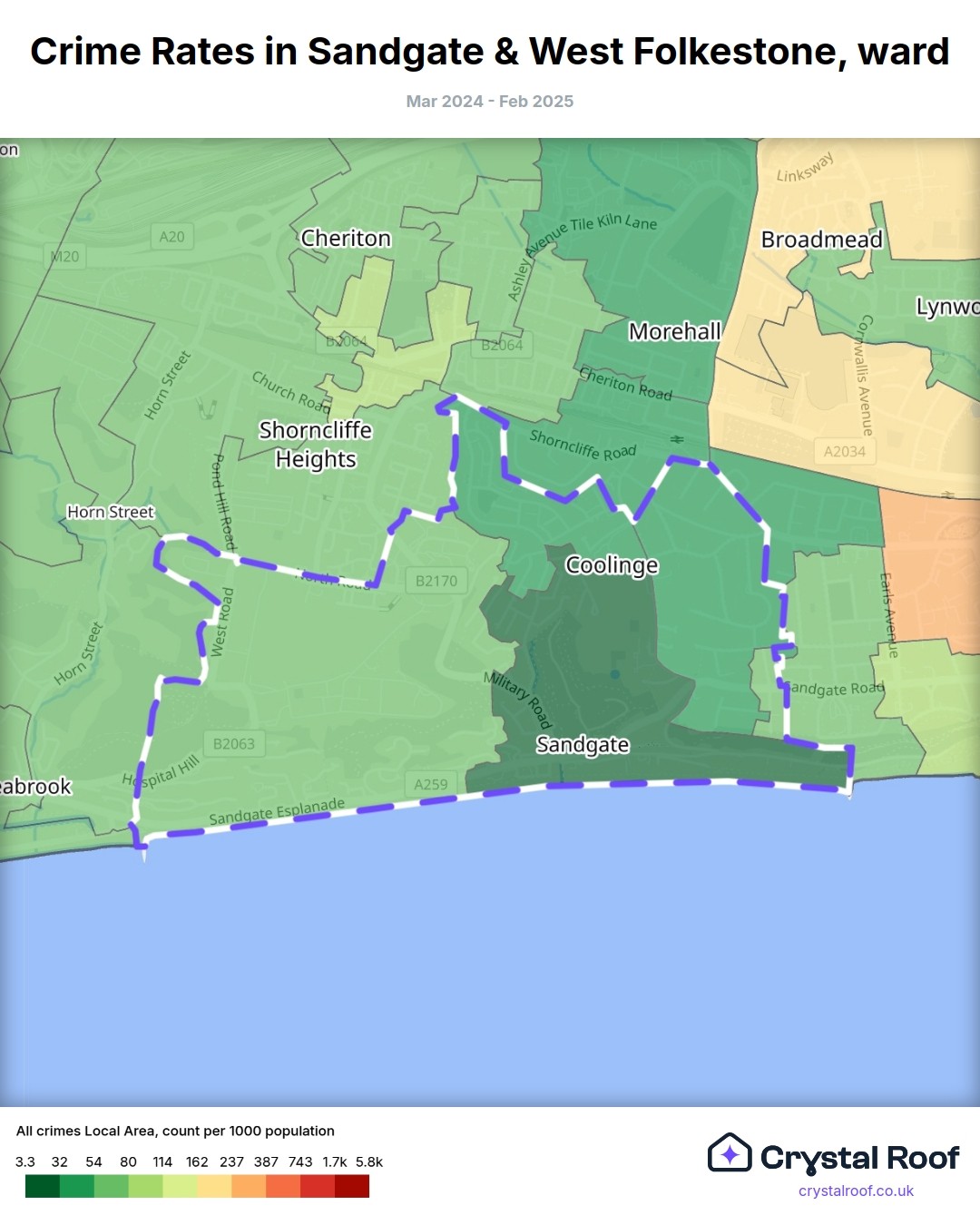 Sandgate & West Folkestone, (ward) includes areas with the following crime ratings (see map):