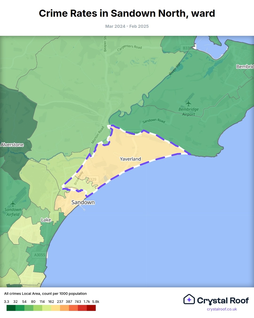 Sandown North, (ward) includes areas with the following crime ratings (see map):